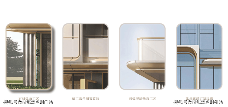 细节之处,大量弧角工艺的处理,特别是高辨识度的定制化弧形线脚,最大程度上消解了建筑的硬朗感,与香槟色铝板勾勒的流畅轮廓,相得益彰。