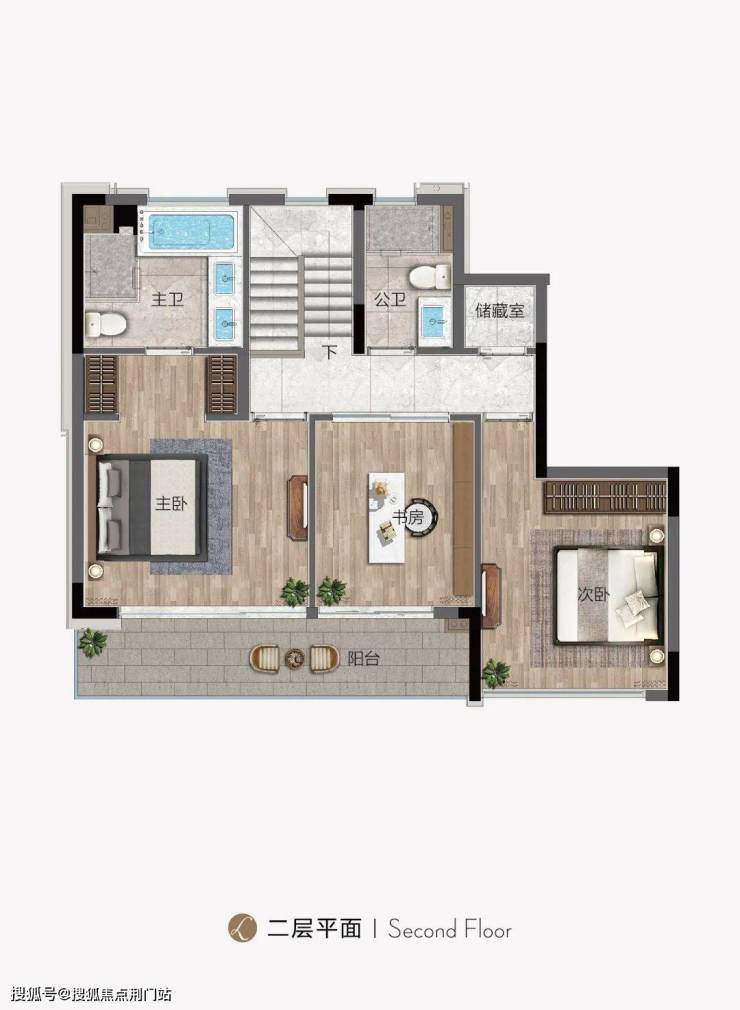 二层空间同样打造了约7.2米长阳台,二层设置了一个豪华套房主卧,以及一个次卧、一个书房以及公卫连通开间约4.2米的主卧与开放式书房,即使起居在二层,南向外接宽境阳台,可以眺望小区的园林美景。