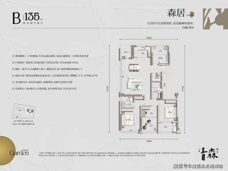 青森首开2号楼的135方户型,这是一个四房两卫,三房朝南的边厅格局。