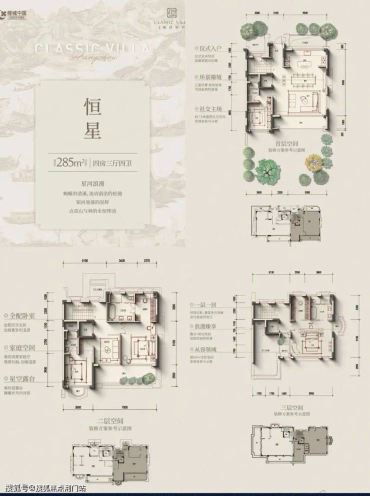 叠排产品遵循“现代形、东方意”内涵,低密产品,最主要追求的就是“有天有地,有私密感”,所以附加值的打造,变得尤其重要。所以,我们先讲的是附加值。建筑面积约235~300㎡四层庐系叠墅,