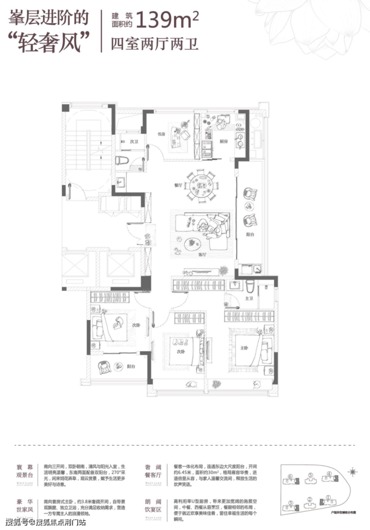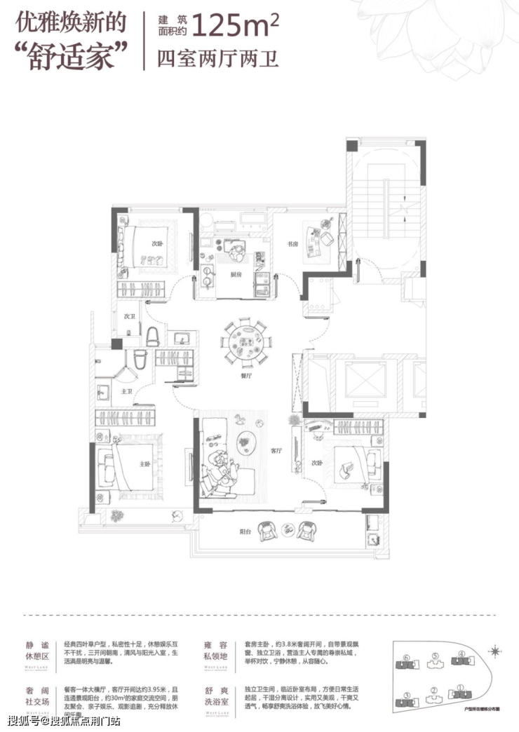 起步户型就是建面约125㎡的四房两厅两卫的户型,起步就是王炸,项目采用了深受市场认可的经典的四叶草格局,这种户型的显著特点,就是消灭过道。客厅居于房子的中心,可以直接到达卧室、书房、厨房等各个空间,将面积利用到优质。