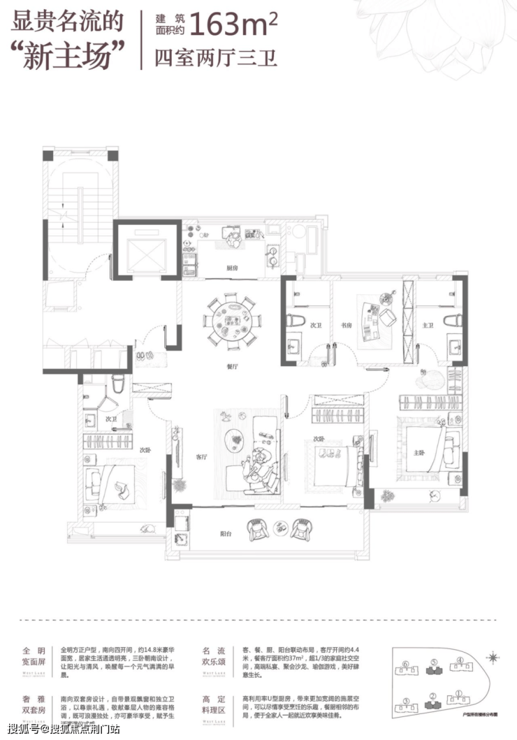 建面约163㎡的户型为项目的较大改善户型,可以说或是集齐了市面上大四房的所有优点。