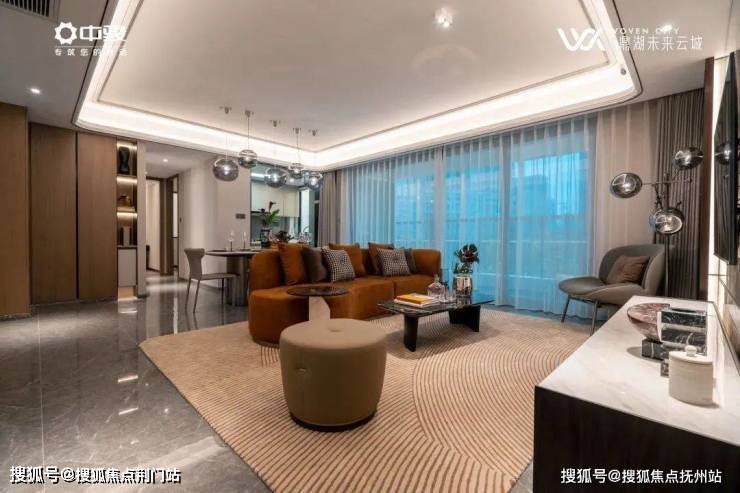 在中骏金辉·未来云城客厅及卧室,梁志天经典造型—三层叠级弧形吊顶装饰天花板,优雅勾勒出高阶生活场域。这项工艺繁复且造价高,耗时为普通吊顶的3倍,常被应用于星级酒店中,足以体现未来云城之用心。