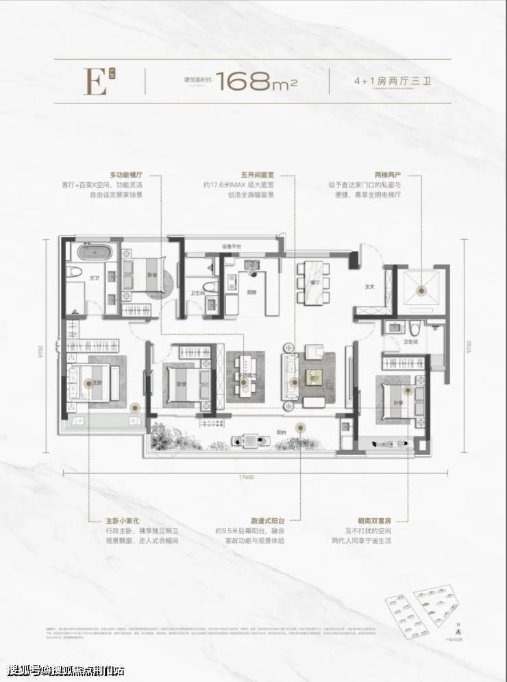 项目规划了98-168㎡多元户型,最引人注目的当属168方大宅,大师级豪宅式设计,最大约17.6米IMAX级面宽、最多五开间,创造全画幅窗景,定义临平“户型王者”。