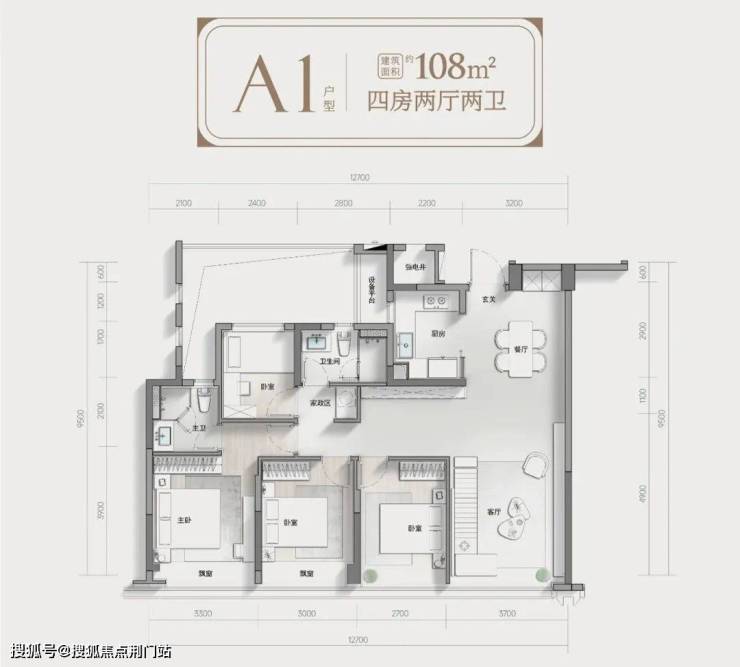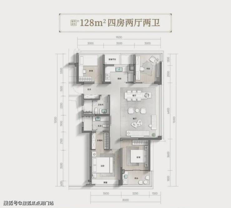 128平方米户型做到了四房两卫,包了阳台,餐客厅整个空间很宽敞,约38平方米。