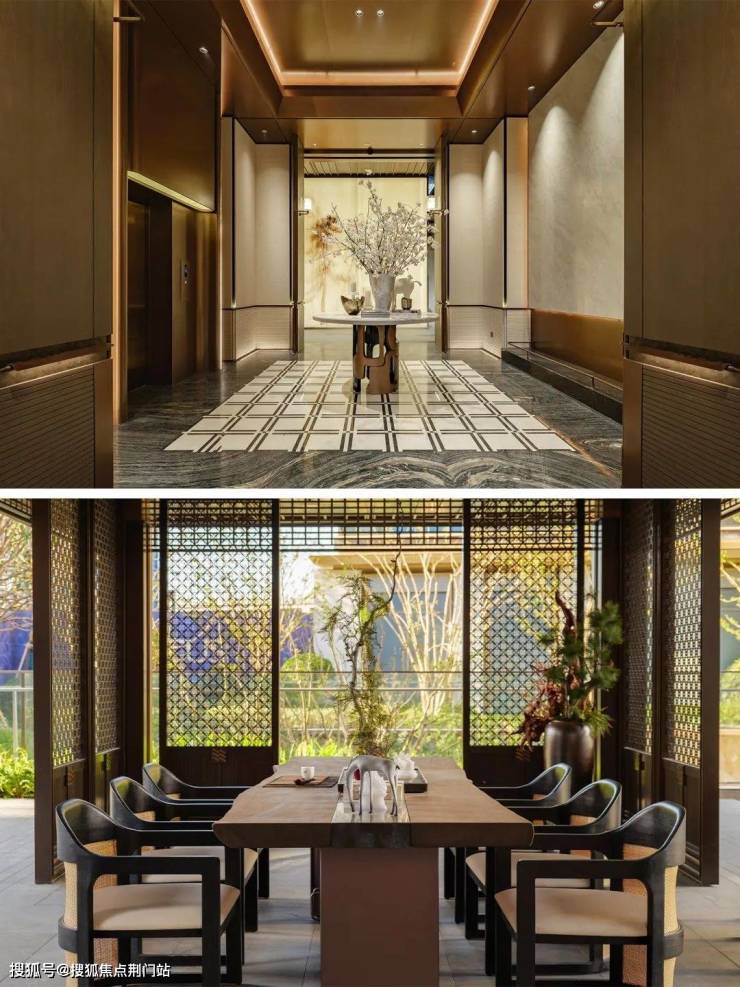 除了得房率出众,项目也有不少地方可圈可点。打造了宽约43.8米大门,四面铝板+大面积玻璃的公建化立面,高窗墙比,看起来很养眼。公区还设计了下沉式庭院、恒温泳池,高层全区覆盖了风雨连廊。