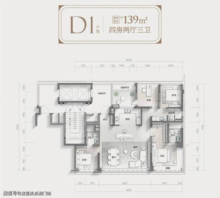 139平方米设计成四房三卫,大横厅,南向开间做到14米,两个卧室都带独立卫生间,这个比较少见,主卧还做了子母门。
