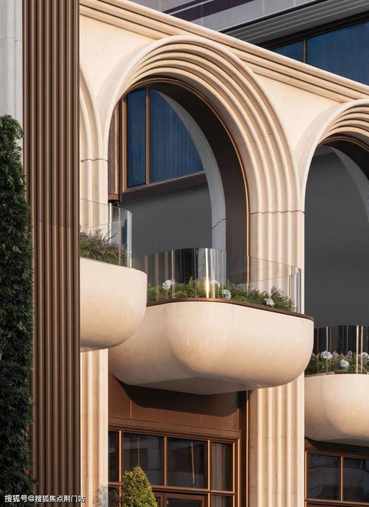 咏印明庐用自己的实践重新定义了下一个十年豪宅应有的样子:贝金米黄石材雕琢的意式拱券,搭配古铜色金属线条和大面玻璃,远看是运河畔一部恢弘的秩序史诗,近观则展现出东西方美学精髓的完美融合。