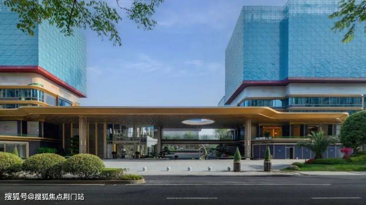 整体的抬高,让约70米宽的鎏金天幕大门头高度达到了约9米,显得格外气势非凡。天桥连接了会客厅、架空层和内部园林。