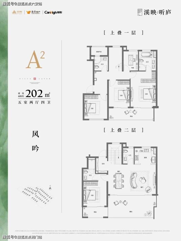 建筑布局采用错位排布,通过巧妙的规划设计保证每户均有良好的采光和视野。园区规划为四列排布,下叠有约220㎡、225㎡、260㎡三种户型,上叠户型依次略小,均为五房格局,满足大家庭的居住需求。
