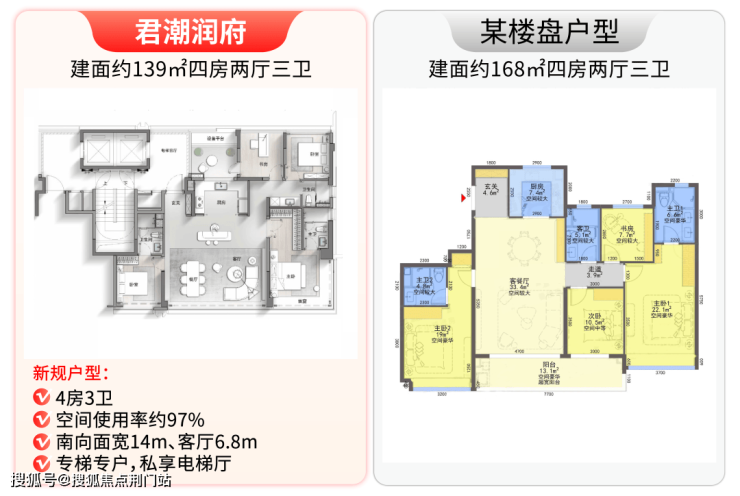 先看全市都罕见的建面约139㎡四房三卫户型。项目利用新规政策,将得房率拉到高约97%,相当于市面上的168㎡户型,买到就是赚到,这在钱江世纪城也是绝无仅有的吧?!