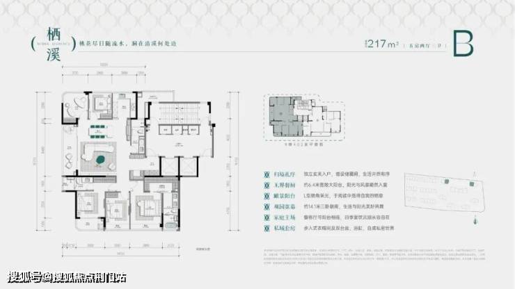 建面约217方则是更大亮点。以来可以弥补此前摇不中建面约241方和建面约238方的客户;二来本身5房的设计,能满足更为复杂的居住需求。三房朝南,餐客厅居中,又连通一个侧向大阳台,更加宽餐客厅视野,构成中岛景观效应。