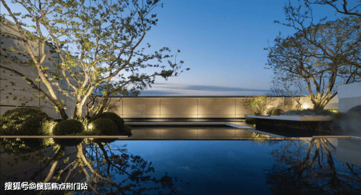 七株精挑细选的红果冬青,生长在层叠的悬浮水院之上。水底的幻彩蓝奢石倒映着天光云影,将杭州的立体山水浓缩进整片园林之中。