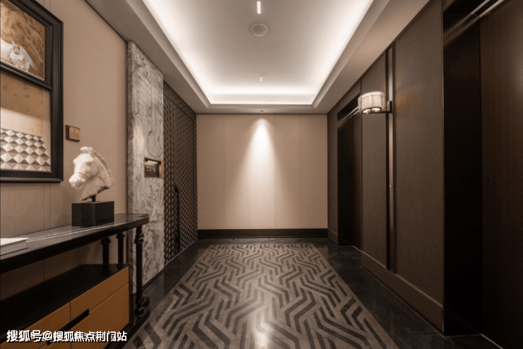 两梯两户+双开门贯通电梯,实际使用起来有近似“两梯一户”居住体验。巨大的电梯厅面积将近13㎡,精装奢石和木纹铝板。