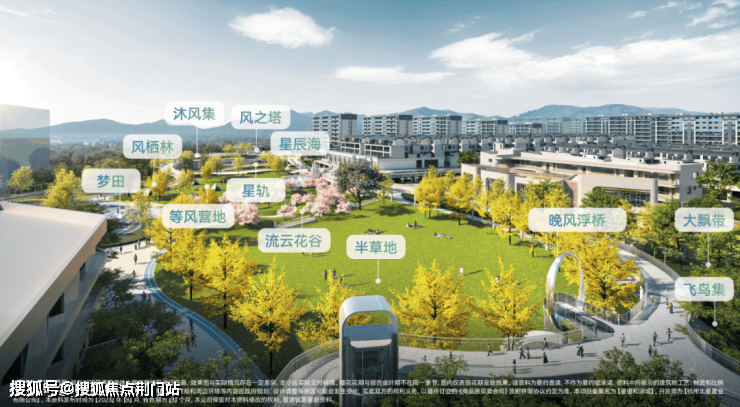 有草坪表演区“ 沐风集”,可以露营的“ 等风营地”,商业街“ 飞鸟集”,自带时间水幕的“ 恒爱星环”……