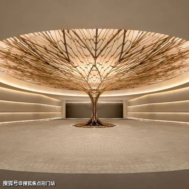 陶砚176㎡户型:取陶砚之自然璞实感,雕琢白冰玉的背景墙,客厅吊顶还原砚台造型,室内饰以瘦金体笔划装饰线条。