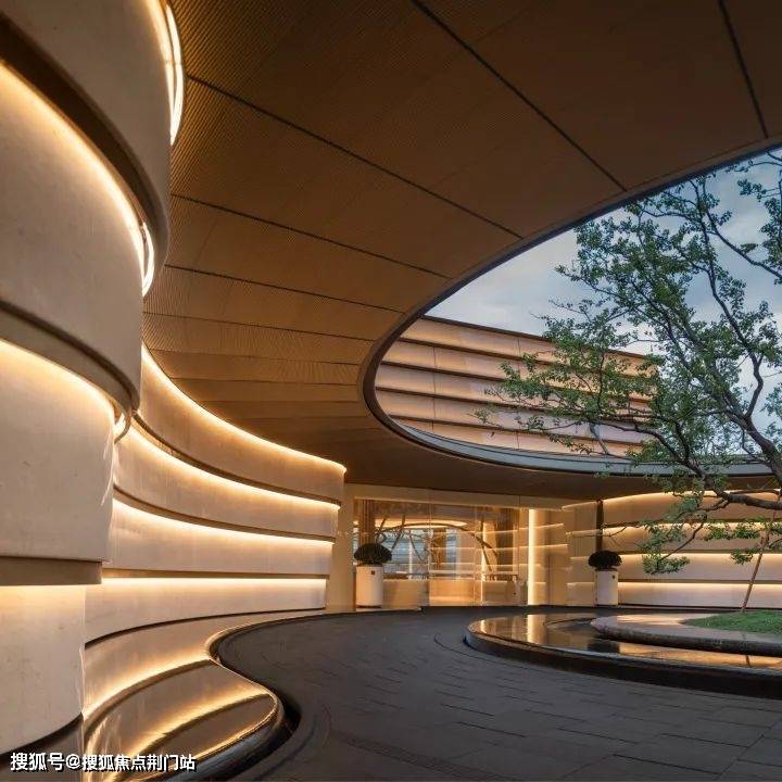 因项目整体抬高,从下沉庭院到架空层“空中花园”的落差极大,形成独特的峡谷地貌,杭序府的设计团队汲取九溪烟树为造园灵感,打造一个立体多维的城市溪谷交互园林;因项目毗邻江岸,杭序府的外立面以“站立的江潮”为灵感,