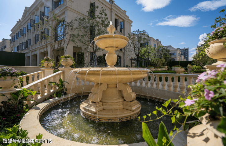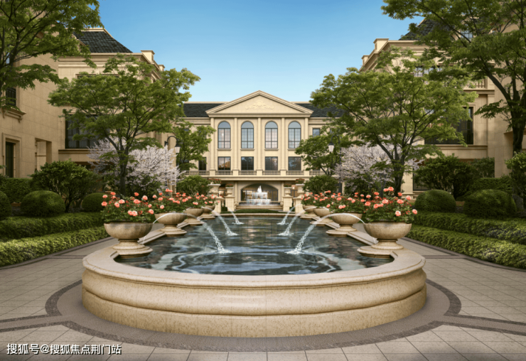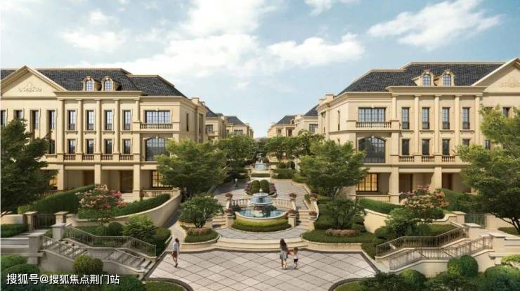 整个园区,以经典的绿城法式墅区景观大中轴贯穿,占地约1000多㎡,联排建筑的设计,融合了中国传统院落布局与法国枫丹白露宫的审美,外立面大面积采用全石材干挂,檐口等细节部位使用仿石。