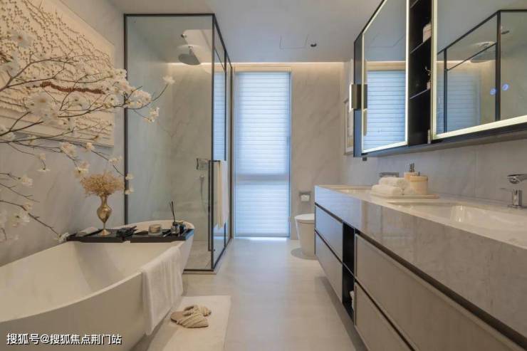有大金的中央空调、新风地暖;厨房用的是嘉格纳的4件套(2台冰箱、蒸烤箱、洗碗机),以及博世的吸油烟机和灶具;卫浴选用唯宝、高仪、汉斯格雅等国际品牌,所有卫生间都配了智能马桶,主卫还配了美妆冰箱。