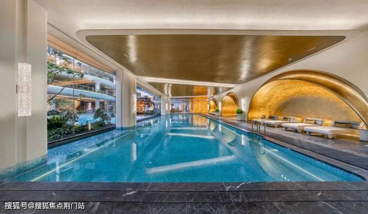 不止于此,元序居然花费重金做到奢石满配:中央车马厅层墙面局部采用雪花白奢石,池壁为巴西利亚黑奢石,池底铺进口黑金砂,溢水台面选用“绿野仙踪”奢石,大堂月光米黄石材,有些地面铺上了太古黑金石材,蓝水晶石材背景墙…