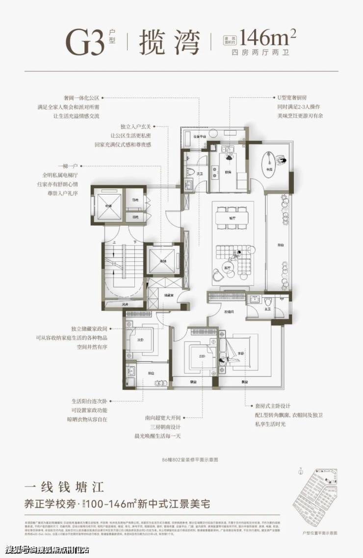 建面约146㎡则分为横竖两款,全部一线朝江。两梯两户,都有独立电梯厅。“横版”是四开间朝南+大方厅,“竖版”有大边厅+超长转角飘窗的“全景舱主卧”。