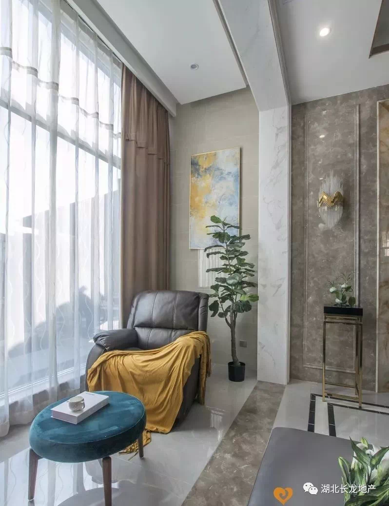 半嵌入式的书柜、以落地灯+地毯归置一方阅读角落,大大的单人沙发,可以美美地宅在家里耗上一个周末。