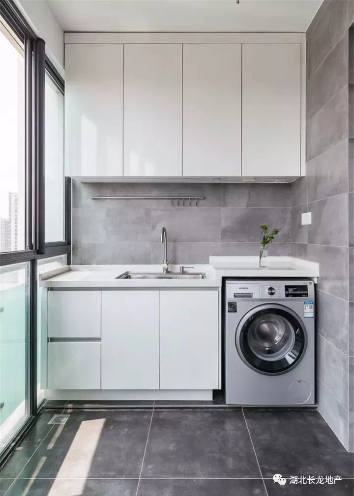 在阳台规划出放洗衣机的空间,如果阳台没有这么大,那么可以利用洗衣机上层空间放置各类清洁用品,安装衣物晾晒架。