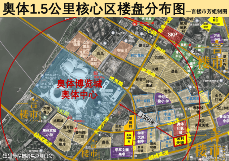 以奥体博览城为圆心,画一个1.5公里的核心区,看看有多少个楼盘在其中?不限价之后新盘只有2个,一个是高层单价卖到10万+的奥映鸣翠,另一个就是保利天珺。