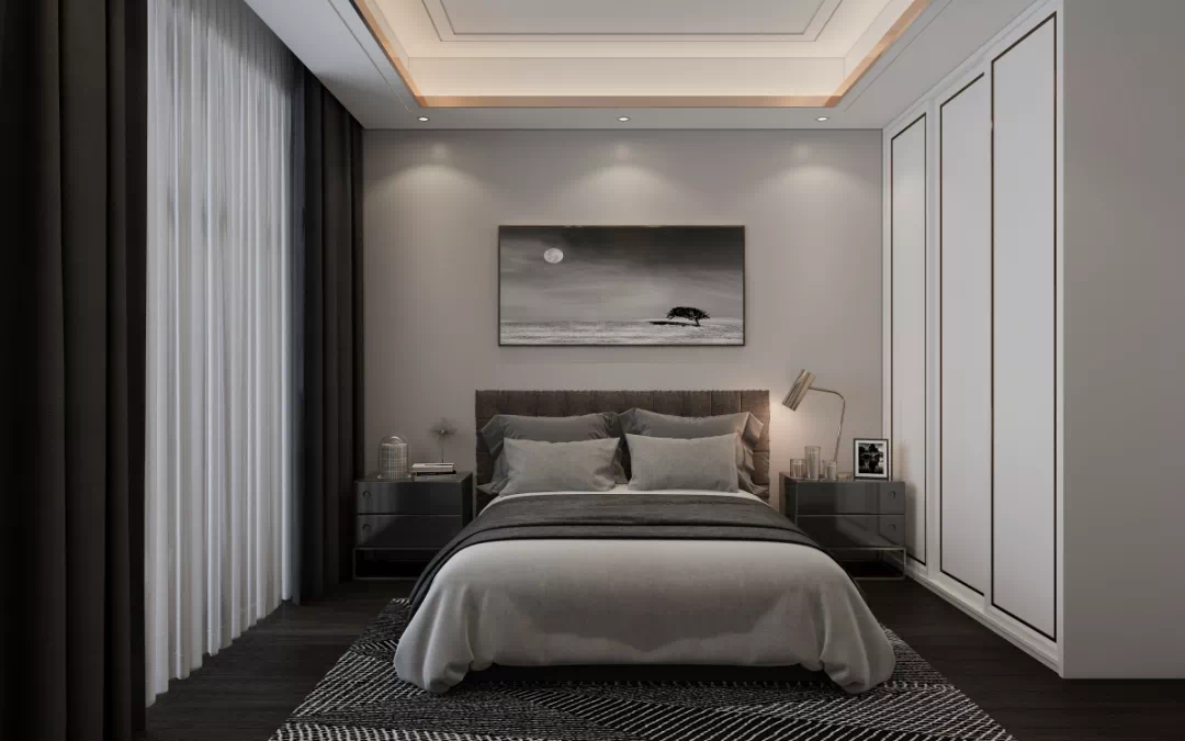 卧室背景运用软吧材质,卧室造型衣柜,搭配顶面金属线条立体感,在设计上追求空间变化的连续性和形体变化的层次感,室内多采用带有图案的壁纸、地毯、窗帘、床罩、帷幔、及古典装饰画,来体现简欧华丽风格。
