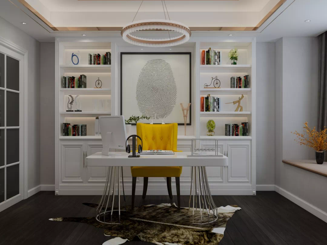 书房白色柜体搭配高级黑地面,黑色烤漆玻璃装饰,来演绎低调奢华,令空间感更加饱满。