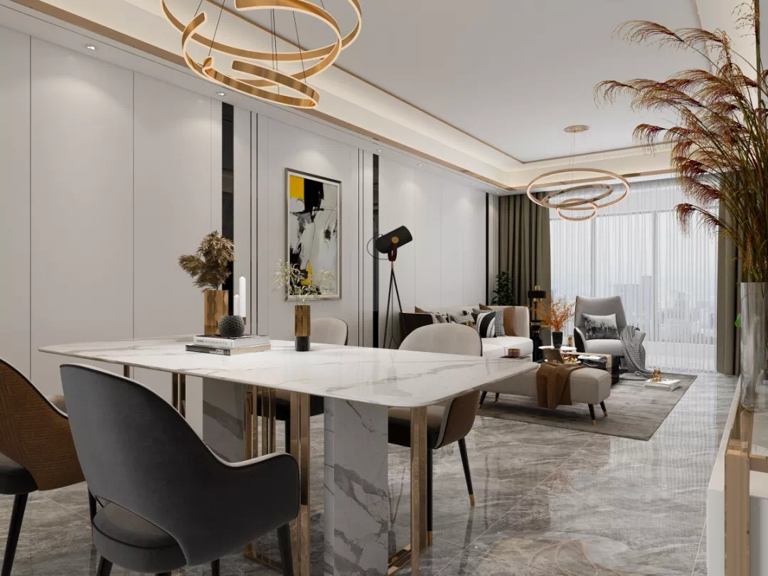 客餐厅空间运用明亮线条欧式线条搭配现代家居,由繁至简,简洁化装饰线条,以明亮的浅色基调为主,加入了简洁、大气的现代元素,创造出高雅、明亮、和谐的气氛。