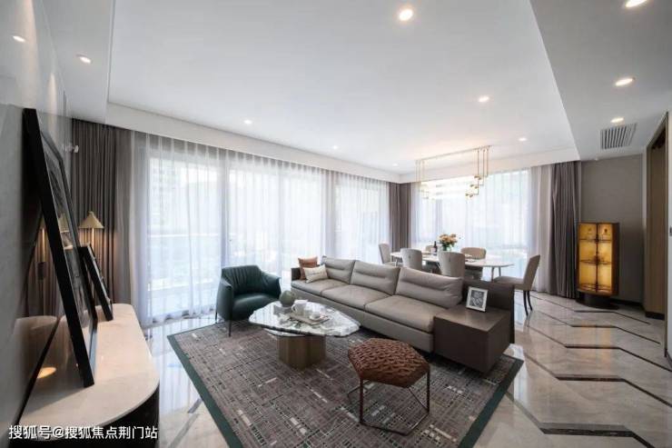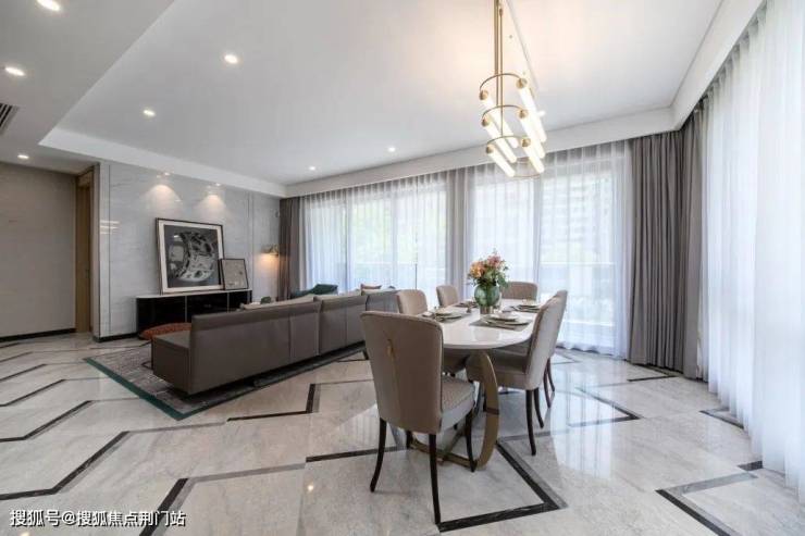 餐客厅及走道地面是三色格纹错拼的Burberry风格高规格大理石地面,水电双地暖,墙面则是石材电视背景墙、全墙纸+木饰面、皮革的卧室背景墙软包;