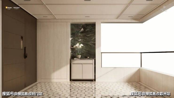 更绝的是,整个电梯厅的外墙都是岩板,门牌号陈列于专属的壁龛中,室外还有一个软装柜作为交标,可以说杭州沄璟,从电梯厅就开始了家的打造。