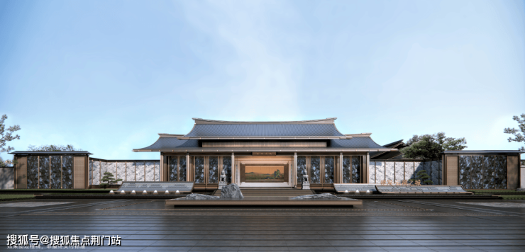 约68米宽的重檐悬山式门楼(含景墙)尺度雄浑,两侧分立石狮、影壁、跌水、罗汉松。