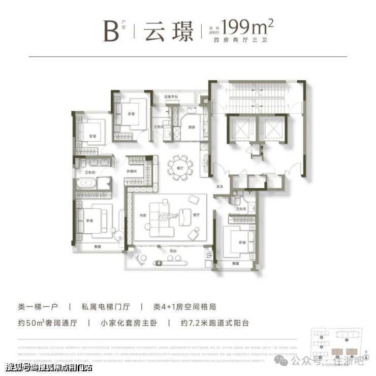 B户型主要分布在2幢和3幢,除了私属电梯门厅以外,B户型的格局上也更加突破,打造类4+1房的空间格局,主卧套房设计,预留独立衣帽间空间,整体约50㎡的奢阔通厅,可满足三代同堂居住需求,南向约7.2m跑道式阳台也让整个餐客厅空间更显阔绰。