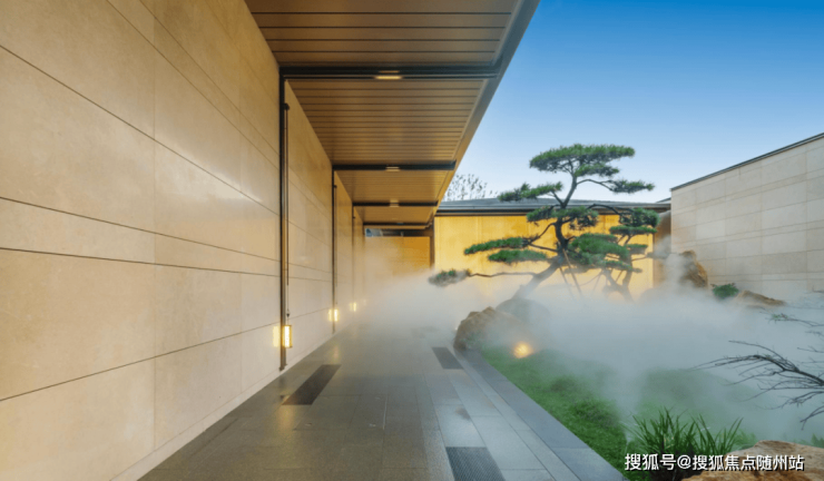 大门取意宋代二坡顶形制,在沉木米黄景墙里,嵌入18块价值百万的透光奢石,叠加苍劲的造型松……