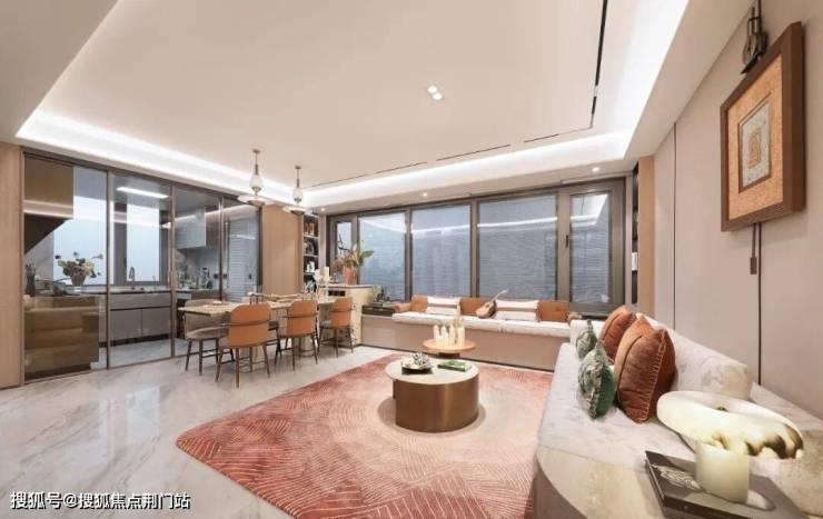 归家动线以环绕下沉式庭院布置。漫步在连廊之上,以水为引再铺陈精选的绿植,随手一拍,松弛气场油然而生。