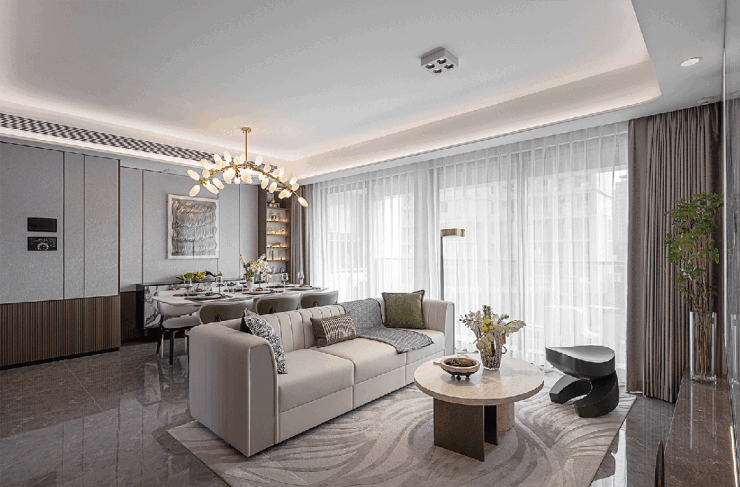 项目内部采用了板块罕有的约3.05米层高设计,厨房更是配置了含洗碗机的厨房三件套,还有全屋墙布、中央空调、地暖、主卧智能马桶等设计,如此“改善”谁能不爱。