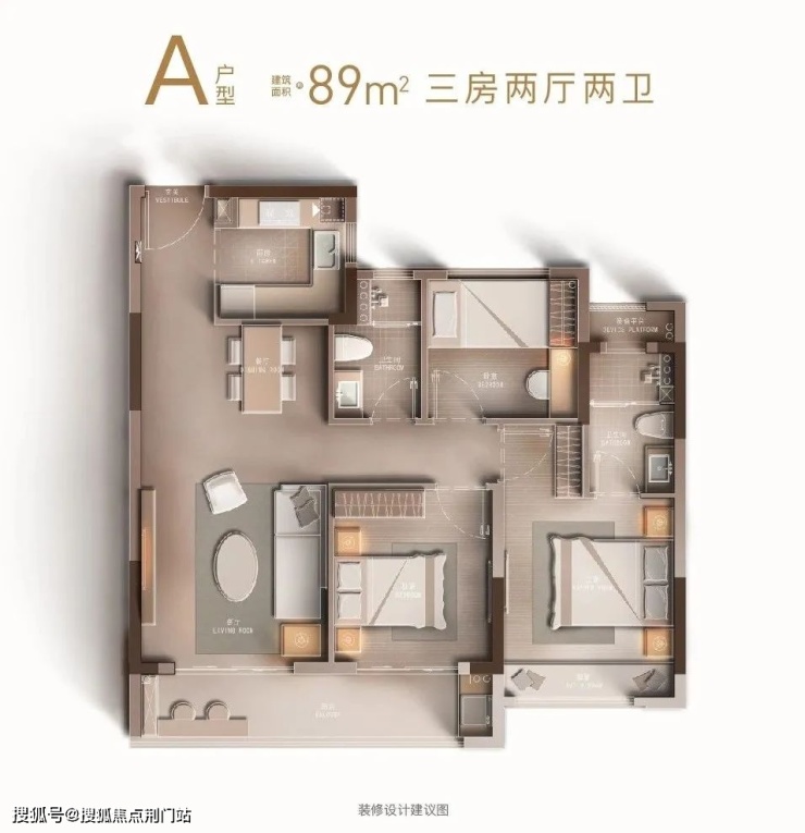 建筑面积约89㎡户型做到三房两厅两卫,三开间朝南,主卧还配有独立卫生间。南向建筑约6.4米阳台。还有开放式的餐客厅一体化设计,舒适宽敞。