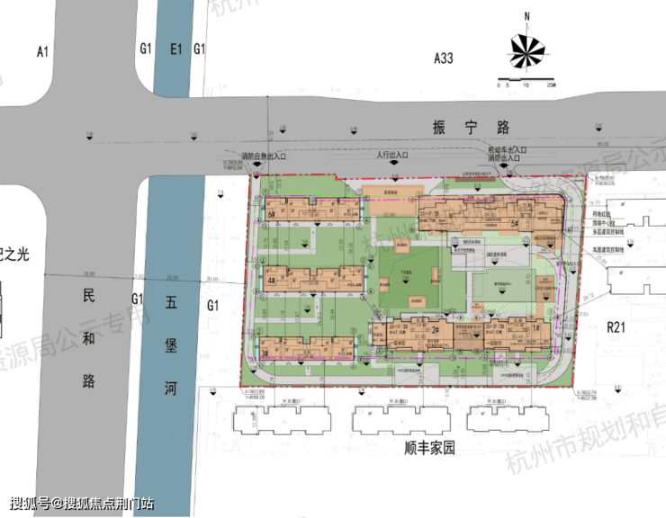主要出入口位于北面的振宁路上,西面有五堡河一线河道景观。