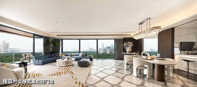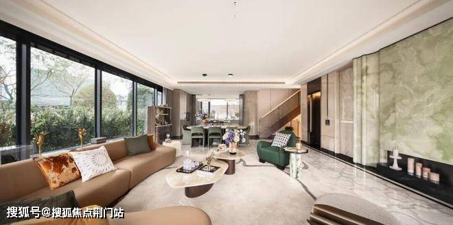在约268㎡户型中,约3.15米层高搭配全景玻璃幕墙,把钱塘江景和社区五重园林“框”进家里,即使在客厅角落,也能看到江风拂过树梢。