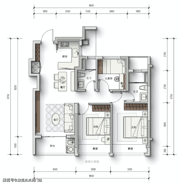 三房两厅两卫设计,三开间朝南,南向开间将近10米,客厅还连通了进深约1.5米的大阳台。