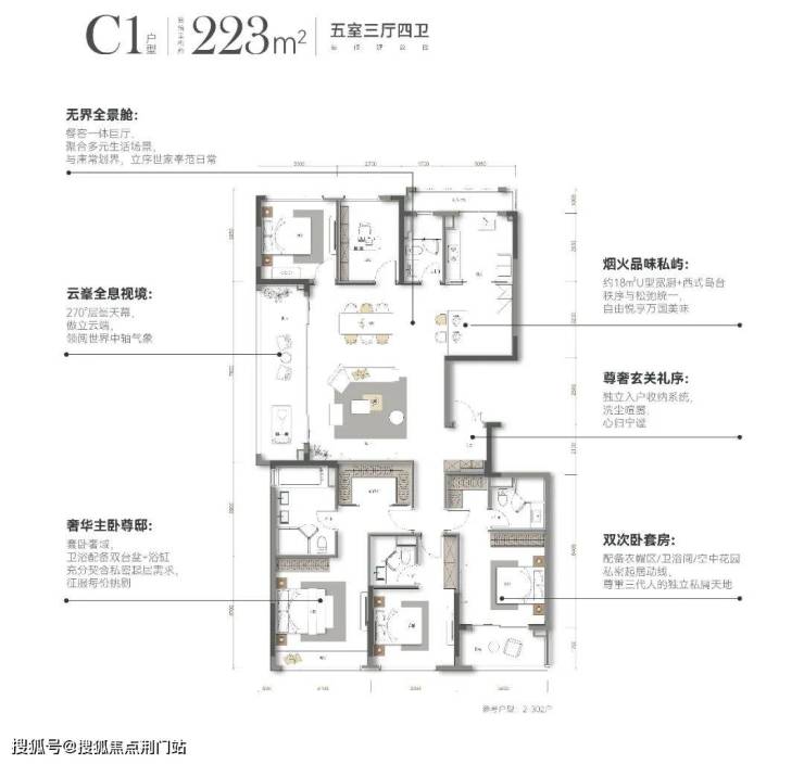 建面223㎡和建面228㎡五房除了有奢华主卧、双次卧套房外,还设计了约18㎡的U型宽厨和西式岛台,以及独立的玄关收纳系统,尺度宽阔如一套平面的别墅。