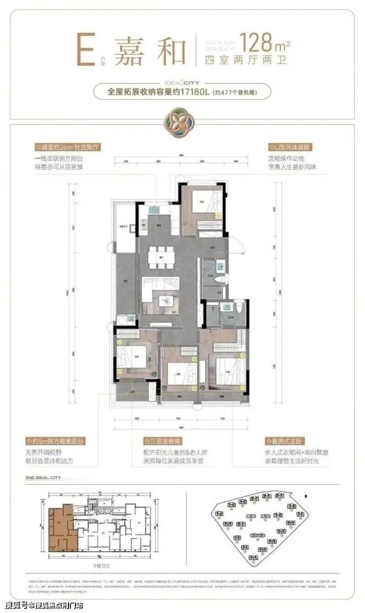 建面约107㎡户型,则把重点放在舒适度上。阔绰方厅+双联阳台,通风赏景至佳,还有U型厨房,三面操作空间,动线流畅好用;套房式主卧更配置了步入式衣帽间,独立卫浴设计,保证了主人家的隐私和仪式感。