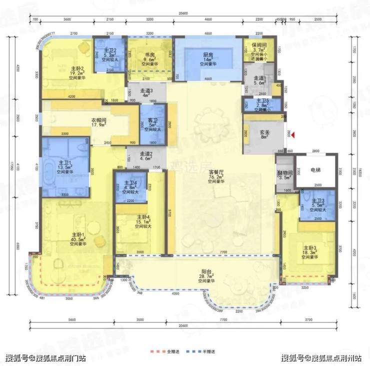❸高层建筑面积约360㎡户型,6房2厅5卫,3梯2户,含赠送得房率约89%。