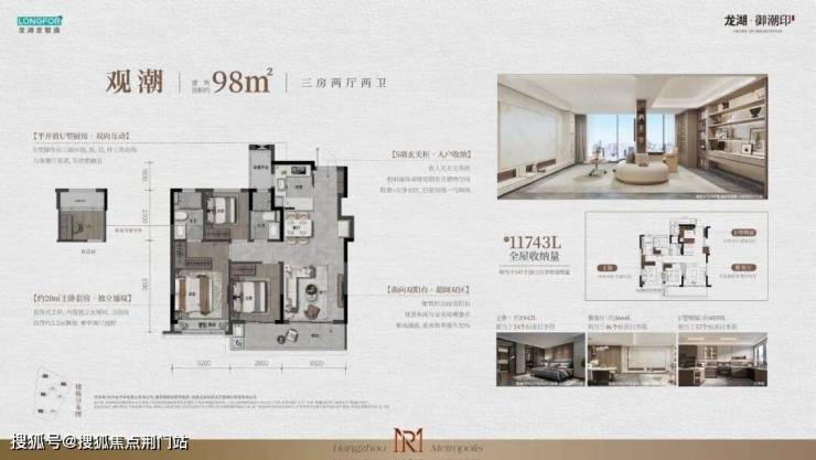 御潮印起步面积约98方,3房2厅2卫,南向约9.5m,双开间阳台全明户型。采用S墙玄关柜、主卧独立衣帽间等多种手段,提高储物效率。御潮印98方给了很多300万预算的朋友,买到钱江世纪城2.0的机会。