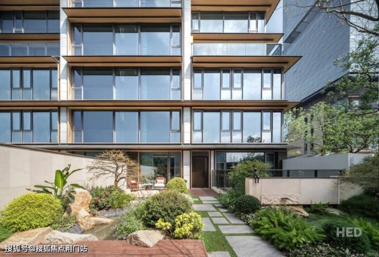 材料选择上,我们强调天然材质与现代工艺的结合。灰白沉稳色调的美国白金石材、深灰厚重的层间金属披檐、细腻精致的暮云金金属线条,这些材料共同营造出内敛而富有温度的外观。