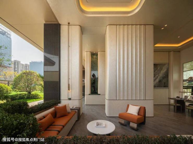 项目邀请GAD操刀建筑设计,在建筑格局上,项目呈"北斗七星"状错落分布,楼间距拉大的同时,视野广度、采光时长也变得更有优势。建筑立面采用“四面铝板+金色边框+大面积玻璃”,并对立面进行体块切分,构建了极致的窗墙比、巨幕视窗和向上升腾的屋顶造型。加上南向全落地玻璃,转角圆弧玻璃工艺,中轴线天际线和大城西“绿肺”尽收眼底。
