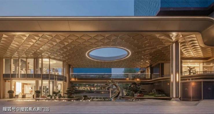 时舟里大门气势恢弘,利用地上架空车库的做法,打造了约9米高的双层高大门,鎏金天幕铺开,横向70米宽的尺度让入口的空间气场拉满。