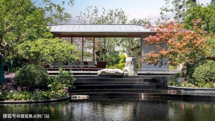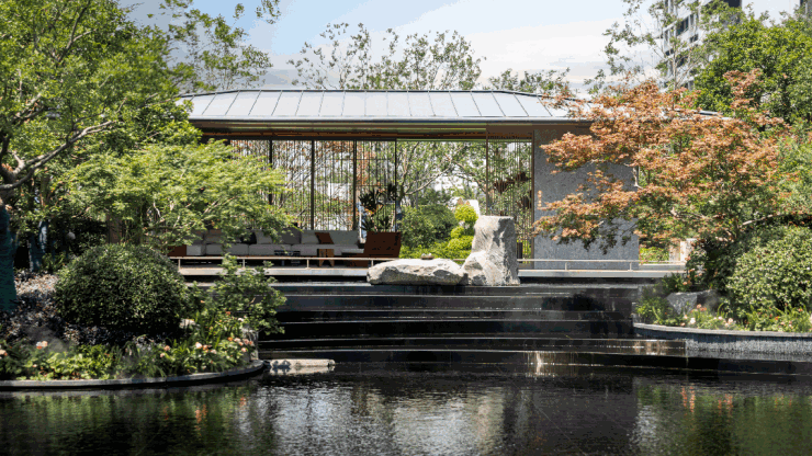 再往里走,约700方廊桥花园为伴的灵动水景,宛如某处山水幽游的绝美景点。水景对岸,装满娴静禅意的日式园亭,婉转水系环绕,无比赏心悦目。
